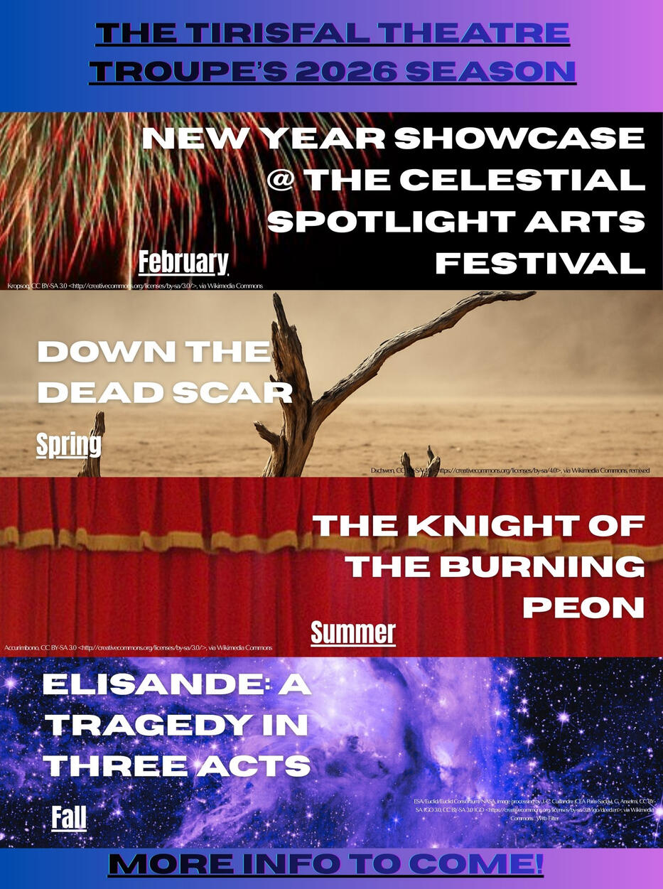 We are pleased to announce our 2026 Season! Expect some laughs, some cries, and maybe some existential dread!We're also performing at the all-new Celestial Spotlight Arts Festival, running February 20th-22nd! Please visit our Spotlight Festival page to learn all the details about attending, performing, and submitting your own play!